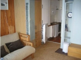 The beds are situated in the living area – there are fold down bunk beds at one side and a double sofa bed at the other. The fold down beds are a great idea to create more space when not in use and allow more space for the dining table and chairs. There is a galley kitchen and a bathroom off to the side.