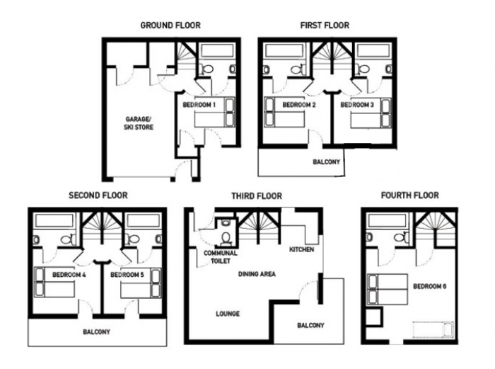 All bedrooms can be configured as twin or double rooms and benefit from a high quality en-suite private bathroom with a shower and bath, sink and WC. There is a cosy lounge, kitchen and dining area with large picture windows enjoying commanding views over the village for a perfect alpine ambiance. Leading out from the lounge area is a south facing sunny aspect balcony overlooking the village and lake. The sleeping areas are on the top floor and the bottom floors with the living areas between the two.