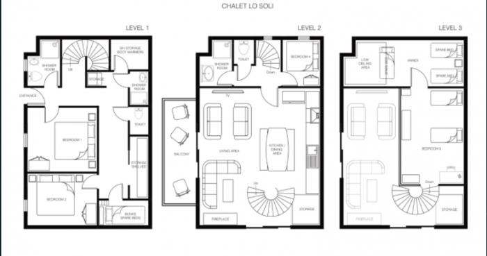 Chalet Lo Soli offers accommodation over 2 floors and a mezzanine area off the living room. The ground level is built on an original stone floor and has 2 double bedrooms and a bunk room (please note the bunk room is very small and is only suitable for children). There are also shower facilities, two WC’s and a ski and boot storage area. Up the beautiful handmade spiral staircase to the first floor, you’ll find another double room and further WC/Shower facilities. The open kitchen and lounge area is also on this level and boasts an open fire and balcony. There is then another double/twin room on a mezzanine level with separate dressing area, which can also be used for an additional 3 beds if required (please note this mezzanine area is open-plan to the dining room, so can have noise issues if you are part of a rowdy bunch. Consideration should be also given to any guests who struggle with steep stairs).