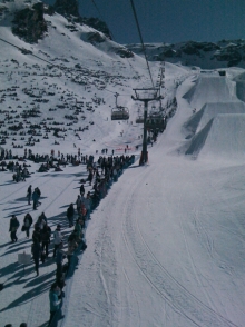 The weather forecast was sun, sun and more sun for the whole week so I was a very happy lady. Of course I love the powder but when a contest is on the last thing you want to be doing is hitting flat light park kickers for a comp. Oakley hooked me up again this year and treated all the athletes to a fully catered chalet in Tignes Le Lac, we had a lovely bunch of staff cooking tasty meals for us all week leaving us with a taste of how it felt to be a spoilt holiday maker.