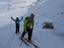 Day two began with a huge communal porridge and we were out the door and hiking bang on 10am. The peaks were still shaded from the sun and it didn't break over the peaks until around 10.30am. The team powered through the first section of the hike, despite achey muscles from the previous day, before setting off on another two-part skin up to the summit. Another group were following in our tracks so the race was on for fresh lines! They had to watch on as we had fresh tracks on the Pointe Nord des Lores face.