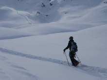 The snow was thigh deep and perfectly light. Apart from a few minor rock hits, the first run down was epic! We skied the northwest facing Col de la Calabourdane for about twenty minutes, taking extra time for ‘stoke level checks’! We were then well and truly in the backcountry. After stopping for a quick drink and a couple of Ady’s dried figs we stuck our skins on, freed the heel, and started hiking.