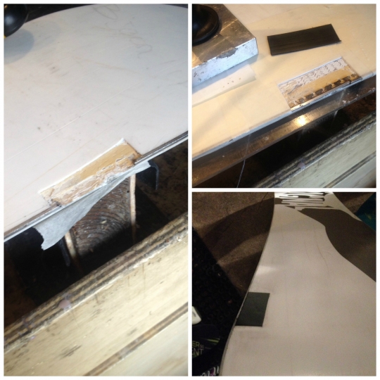 The staff at Tignes Spirit were extremely helpful and friendly, when I told them I was coming over from Val d'Isere they offered to collect and return my board free of charge. They were also very honest that the repair may not be perfect due to the edge damage. When they returned the board to me they had filled in all the gauges with P-TEX, waxed the board and most importantly they flattened and glued the edge in place and filed it smooth.