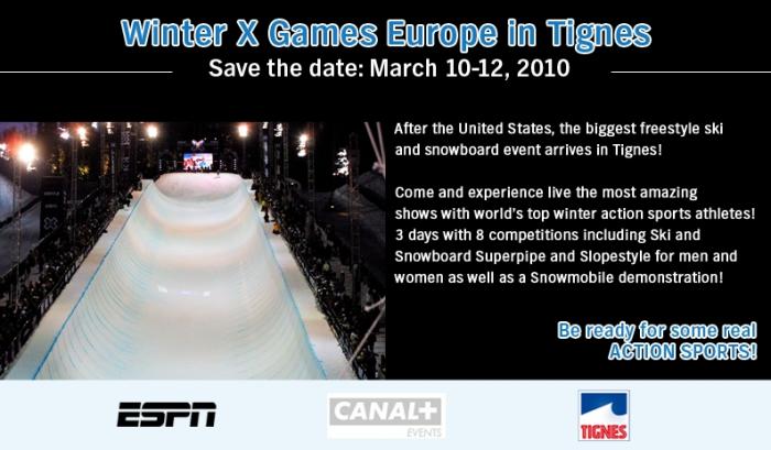 Rick Alessandri, ESPN Senior Vice President and Managing Director, X Games Franchise said, “Working with CANAL + and Tignes, and drawing on more than 10 years experience of running the Winter X Games in the United States, we are excited to bring winter action sports fans in Europe the best action sports event they will see in 2010. This first event outside the U.S. reflects the continued global growth of the X Games franchise as well as the progression of action sports in Europe.”