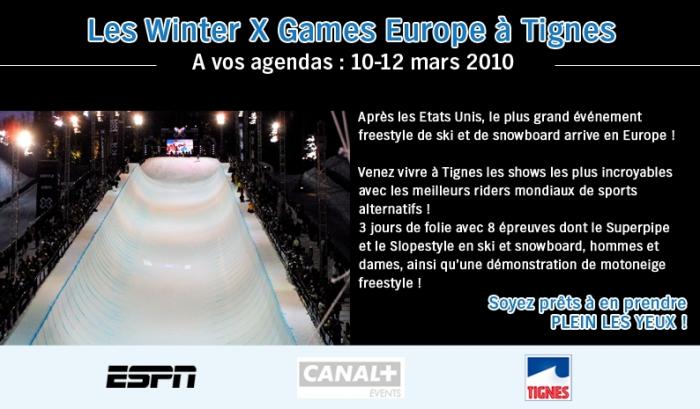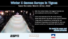 ESPN, CANAL + Events and Tignes Ski & Snowboard Resort will launch the first Winter X Games Europe March 10-12, 2010. The event will be the first Winter X Games held outside the United States.