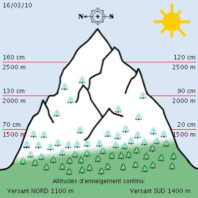 The snow began between 1000 and 1600 meters depending on exposure and slope. It is timely: in Bauges">Bauges and Beaufortain: 25-60 cm at 1200 m, 100 m to 1500 cm, 150-180 cm 1800/2000 m. Moreover, at 1500 m: 60-70 cm, 1800/2000 m: 60 to 150 cm, 3000 m: 210 cm. These values are often below average from early March except HauteMaurienne.