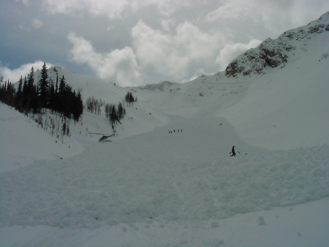 I notice that Tim doesn't have his skis. It seems that not everyone saw the avalanche release. Once it was past the narrow neck of the gully, it fractured outwards, sweeping towards the group.