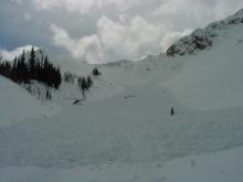 Trevor too was caught. He still had his jacket off and was facing towards the gully as the avalanche released. He had to kick-turn before pushing himself clear, and was caught up in the outermost edge of the debris. The force wasn't great enough to knock him over, but he was carried a few metres downhill and his skis wrenched off.